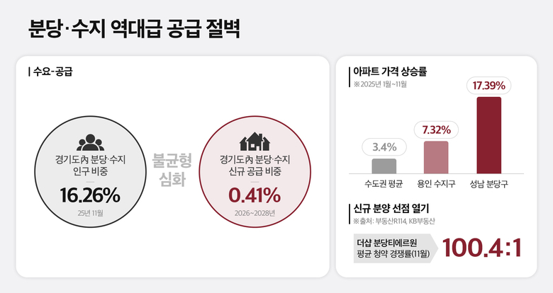 수도권 핵심 주거지로 꼽히는 성남 분당구와 용인 수지구가 전례 없는 공급 절벽 국면에 들어섰습니다. 향후 3년간 신규 아파트 입주 물량이 800여 가구에 불과한 것으로 집계되면서 수요 대비 공급 부족이 집값과 청약 시장을 동시에 자극하고 있습니다.