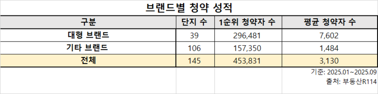 반면 기타 브랜드 단지는 106개로 전체의 73%를 차지했으나, 청약자 수는 15만7350명(34.6%)에 그쳤습니다. 단지당 평균 청약자 수로 보면 메이저 브랜드는 약 7600명, 기타 브랜드는 1500명 수준으로 5배 이상 차이가 벌어졌습니다.