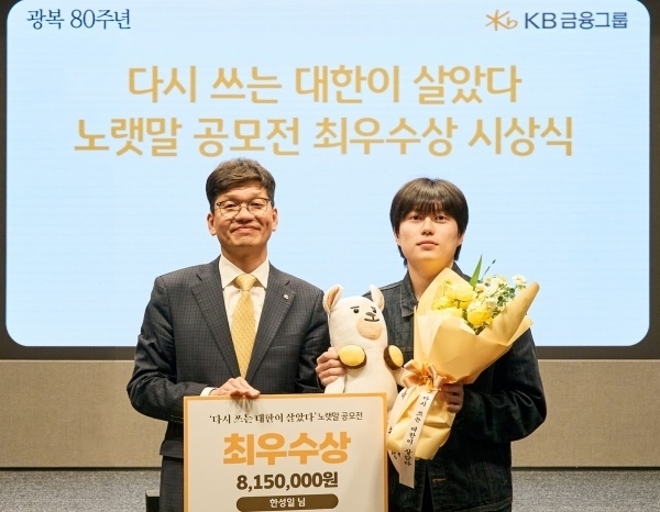 KB금융그룹(회장 양종희)은 광복 80주년을 맞아 진행한 ‘다시 쓰는 대한이 살았다’ 노랫말 공모전에서 대학생 한성일 씨의 응모작을 최우수작으로 선정했다고 27일 밝혔습니다. 이번 프로젝트는 음악감독 정재일의 선율 위에 국민이 직접 작성한 노랫말을 더해 모두가 함께 부를 수 있는 곡을 만드는 캠페인입니다.