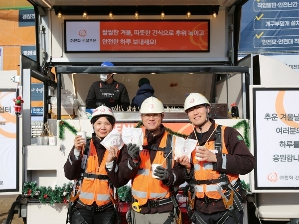 한화 건설부문은 지난 12월 16일부터 내년 1월 30일까지 현장별로 간식차를 순차 운영하며 혹한기 근로자 지원에 나서고 있습니다. 지난 22일에는 대전하수처리장 현대화 공사현장을 찾아 현장소장과 협력사 직원, 일용직 근로자 등 약 400여 명이 참여했습니다.