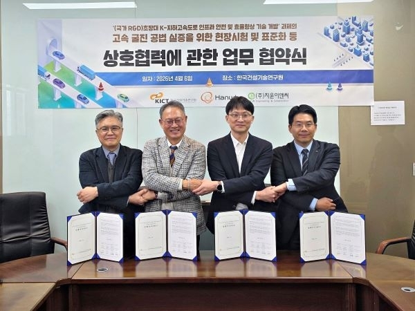 ㈜한화 글로벌부문은 한국건설기술연구원, ㈜지윤이앤씨와 함께 고속굴진공법 실증을 위한 업무협약을 체결했다고 8일 밝혔습니다. 협약은 지난 6일 한국건설기술연구원 지반연구본부에서 진행됐으며, ㈜한화 글로벌부문 IS사업부와 K-지하고속도로 연구단, ㈜지윤이앤씨가 참여했습니다.