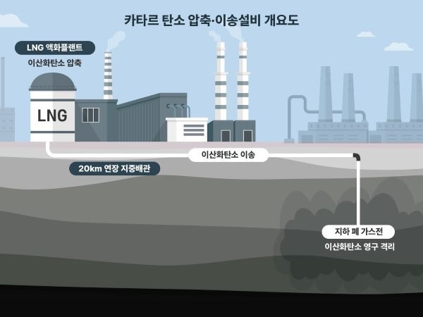이번 프로젝트는 LNG 액화플랜트에서 배출되는 이산화탄소를 압축하고 수분을 제거한 뒤, 약 20km 길이의 지중 배관을 통해 폐 가스전 지하 공간으로 이송·격리하는 탄소포집·저장(CCS) 설비를 구축하는 사업입니다.