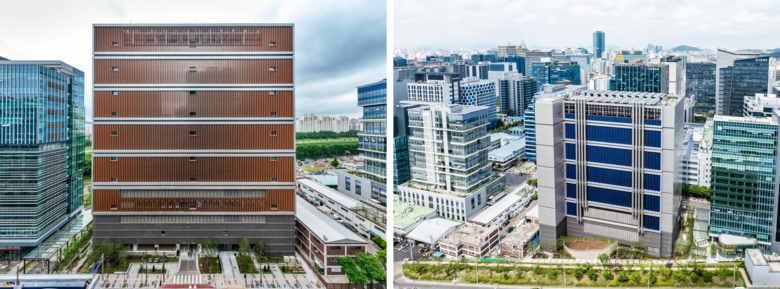 외관은 서버랙을 모티브로 한 금속 루버(Louver) 디자인을 적용해 기능성과 상징성을 함께 높였습니다. 건물 후면에는 일조량 분석을 기반으로 163.38kW 규모의 태양광 설비를 설치해 에너지 절감 효과를 강화했습니다. 서버 냉각 성능을 높이기 위해 컨테인먼트 구조를 도입한 점도 특징입니다.