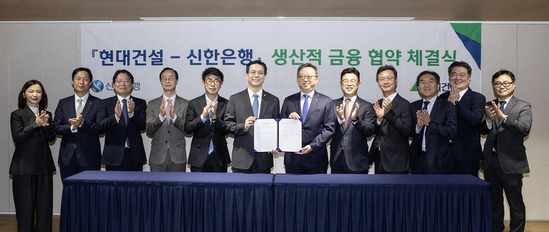 현대건설은 지난 13일 서울 종로구 계동 본사에서 신한은행과 ‘생산적 금융 협력을 위한 양해각서(MOU)’를 체결했다고 19일 밝혔습니다. 협약식에는 이한우 현대건설 대표이사와 정상혁 신한은행 은행장을 비롯해 양측 주요 관계자들이 참석했습니다.