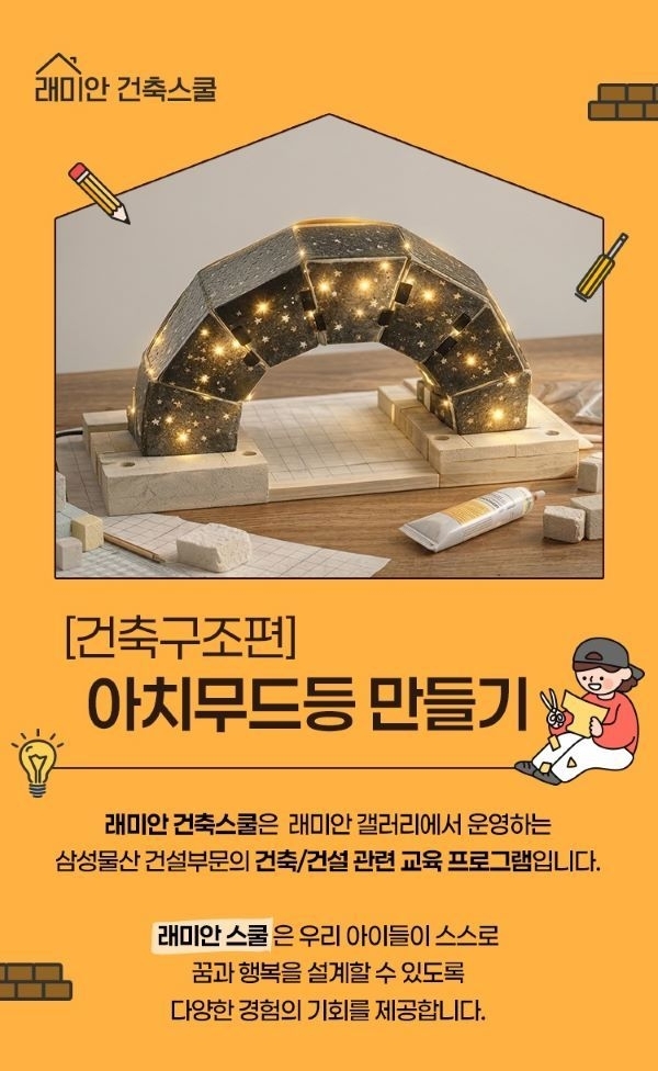 삼성물산은 전시와 함께 브랜드 체험 프로그램도 확대했습니다. 어린이와 청소년을 대상으로 운영되는 ‘래미안 스쿨’에서는 디지털과 체험형 학습을 결합한 교육 콘텐츠를 제공합니다. 로블록스 기반의 공간 설계 체험 프로그램과 건축 원리를 이해할 수 있는 ‘아치 무드등 만들기’ 활동이 대표적입니다.
