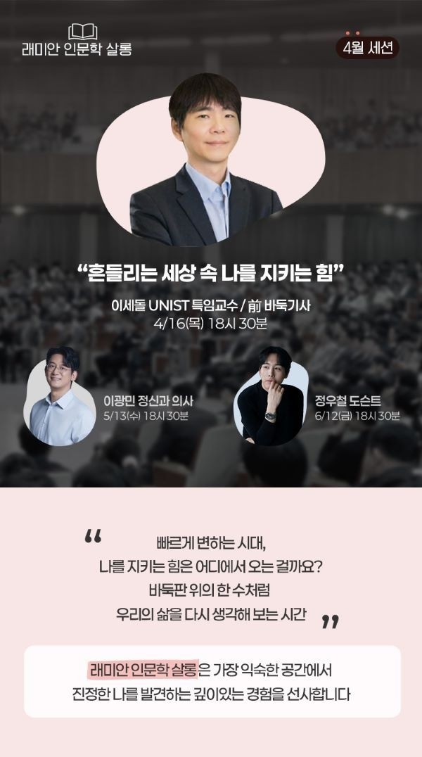 강연 프로그램은 이달 16일 이세돌 전 프로 바둑기사의 강연을 시작으로 진행됩니다. 이후 5월에는 이광민 정신과 의사의 가족 소통 심리학 강연, 6월에는 정우철 도슨트의 예술 강연이 순차적으로 예정돼 있습니다. 전시 관람과 프로그램 참여 일정은 래미안 공식 홈페이지를 통해 확인할 수 있습니다.